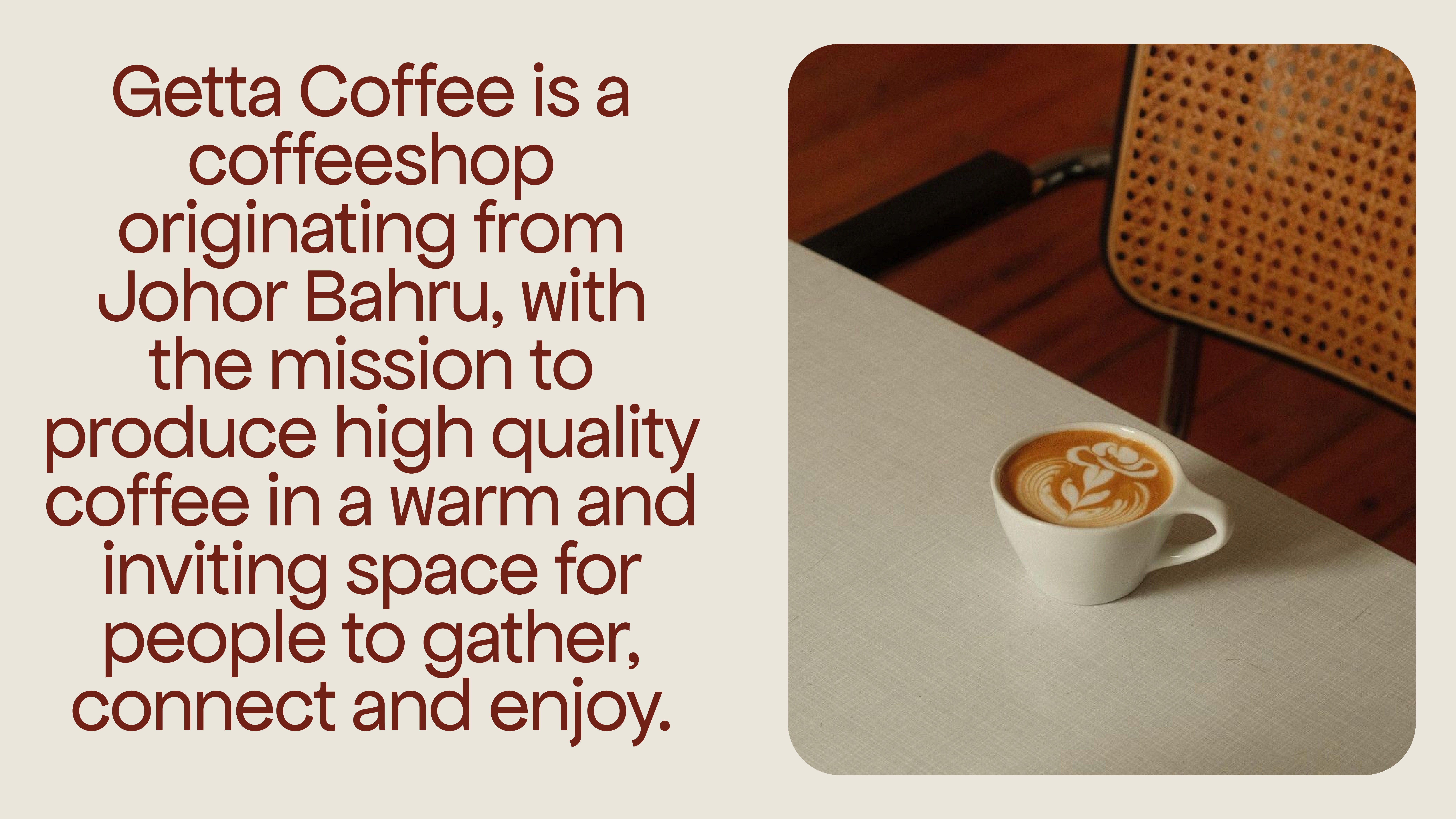 Getta Coffee is a coffeeshop originating from Johor Bahru, with the mission to produce high quality coffee in a warm and inviting space for people to gather, connect and enjoy.